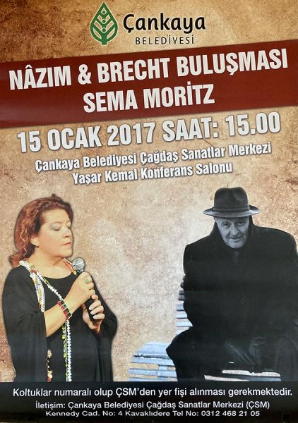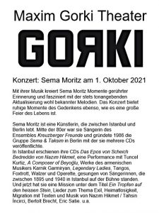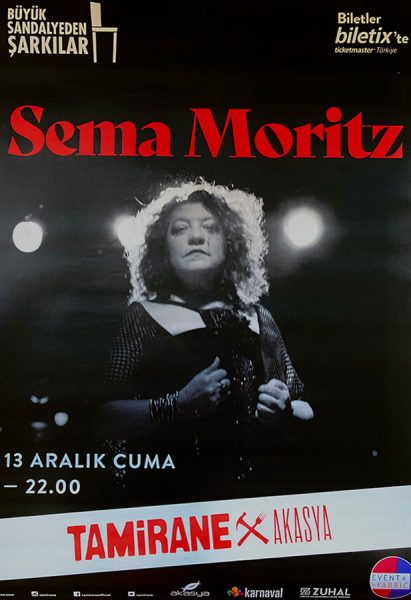 Sema Moritz hat in ihrer über 40-jährigen Karriere als Sängerin und Interpretin verschiedenster musikalischer Formate eine Spannbreite gesanglicher Techniken entwickelt, die ihresgleichen sucht. In ihrem Repertoire finden sich neben Jazz, Tango, zeitgenössischen Songs und Improvisationen Lieder aus Anatolien, die die Vielfalt der Kulturen dieses großen und reichen Landes repräsentieren.